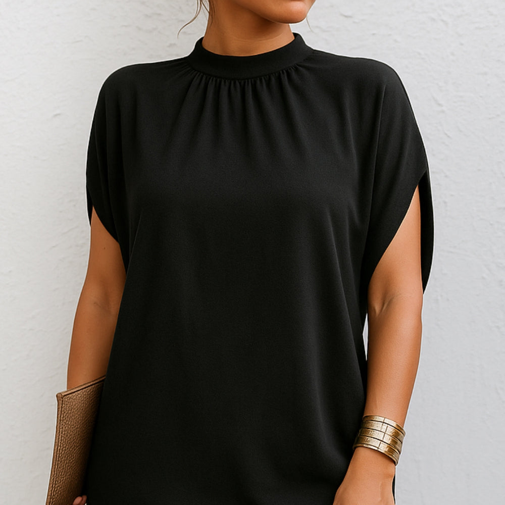 This modern shift dress delivers refined minimalism with a graceful silhouette that moves with you. Featuring a high gathered neckline, airy cap sleeves, and a fluid shape, it’s the perfect blend of polish and ease. Designed for all-season wear, it's a timeless staple made for dressing up or winding down.