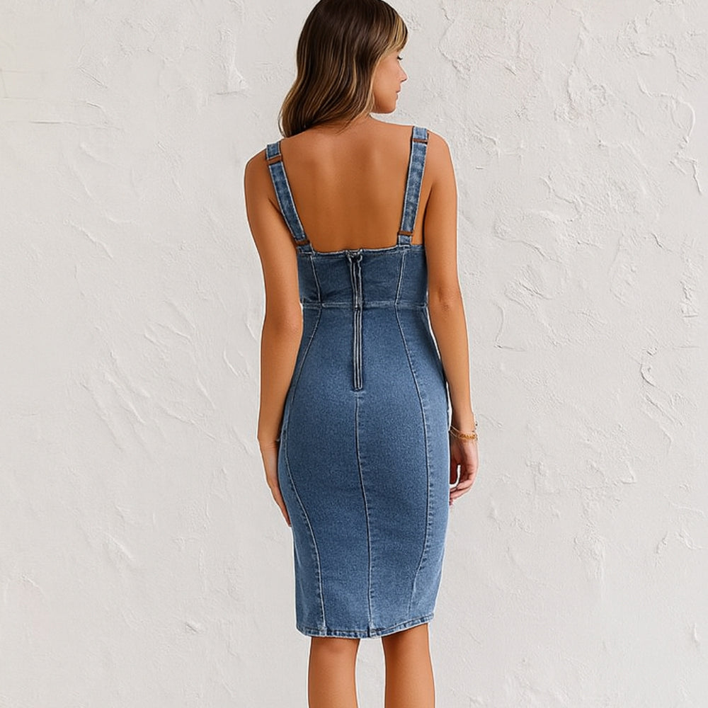Step out with poise in this beautifully tailored denim dress designed to flatter, inspire, and impress. With a graceful V-neckline and a subtle front slit, this piece delivers understated elegance that works from day to evening. Whether paired with sleek heels for a polished dinner look or layered with a jacket and flats for a chic day out, it offers timeless style for women who value comfort and refinement. Designed with adjustable straps and a flattering fit, Maura celebrates curves without compromising on elegance.